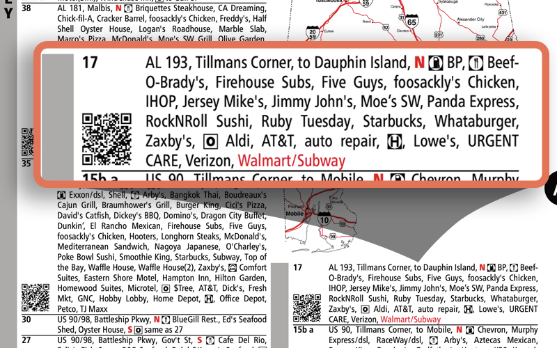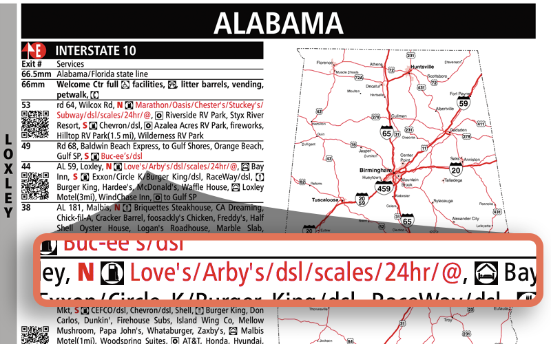 Services highlighted in red indicate roomy parking lots, tall awnings and wide drive-throughs to help folks driving larger vehicles such as Moving Vans, RV's, Big Rigs or Semi Trucks plan low stress stops while navigating the big road.